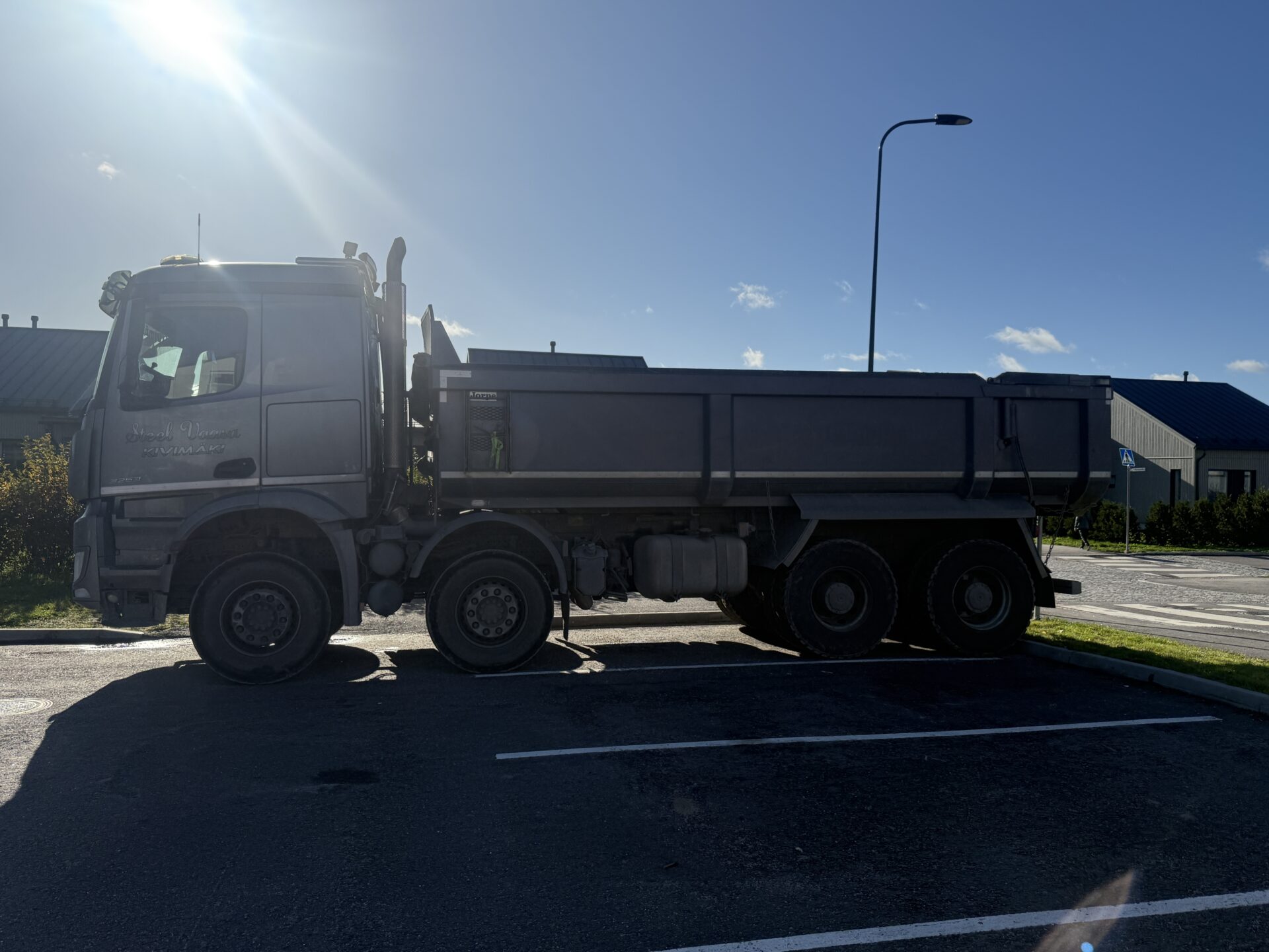 Todella siistikuntoinen ja hyvin huollettu Mersun sorakuorma-auto isoilla massoilla ja paksupohjaisella lavalla.