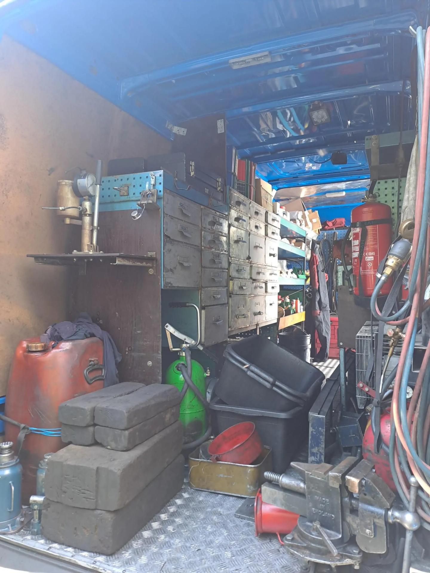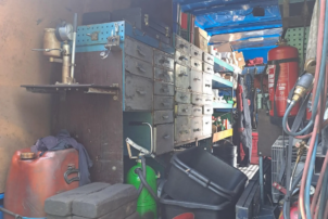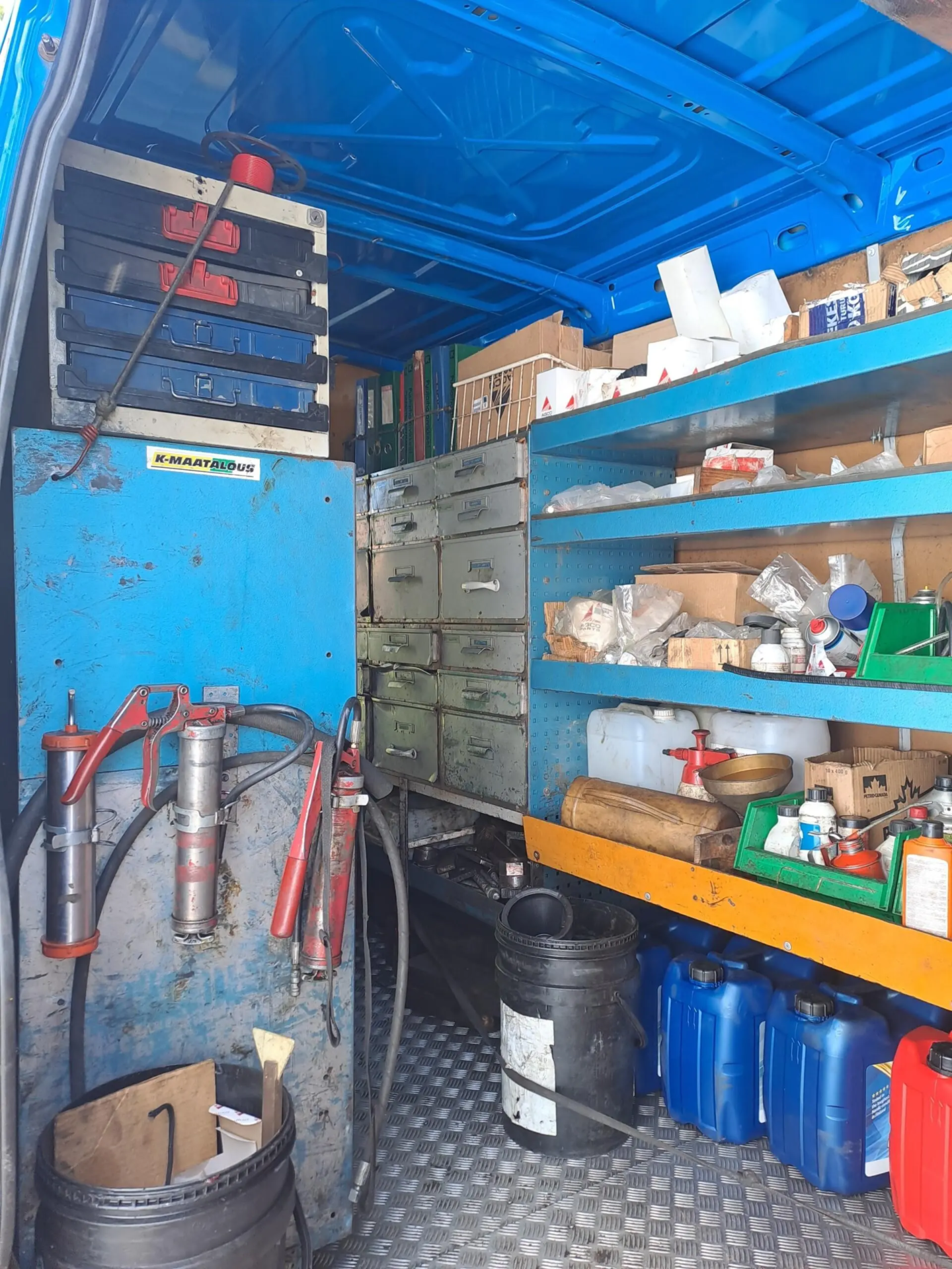 Työpöytä, varaosalaatikot, hyllyt, ruuvipenkki, kompura